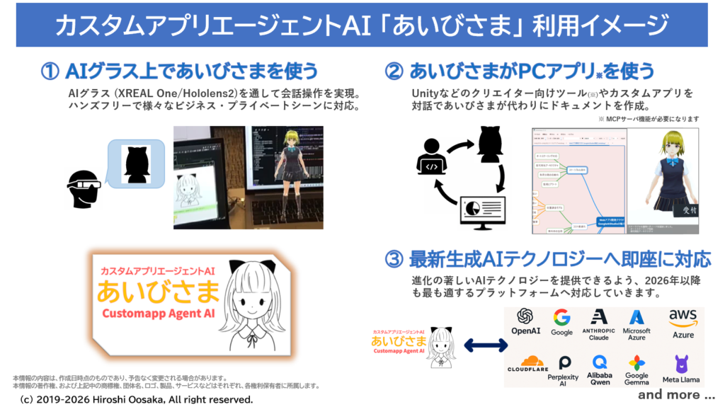 「あいびさま」は、プロジェクト管理を代行するアシスタントAIとして2019年から開発されました。2025年からは生成AIの爆発的な機能および性能の向上により、プロジェクト管理アプリケーションにとどまらず「MCP」クライアント機能実装し、あらゆるMCPサーバ対応アプリケーションに、チャット/音声対話/AIグラスを通して直接操作をすることができるようになりました。また、MCPサーバ機能を搭載しないアプリケーションやシステムにも、同等のフルカスタムアプリケーションを素早く開発することで、あらゆる種類のアプリケーションを操作できるようになりました。