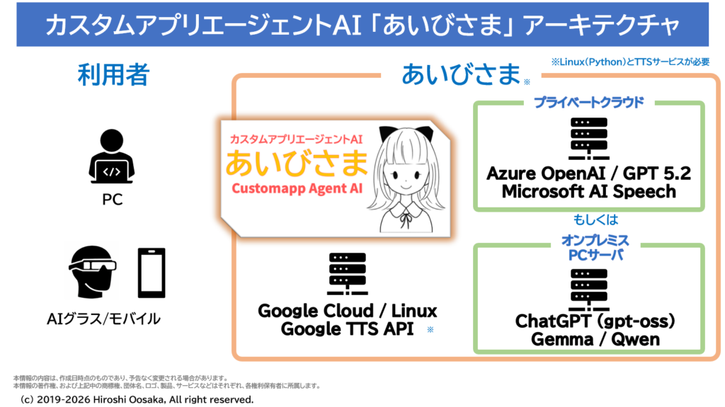 あいびさまはGoogle ClaudやMicrosoft Azureなどのプライベートクラウドや、オンプレミス/PC上に構築することができ、特定のベンダーに依存しない設計となっております。昨今激しさを増す生成AIテクノロジーに即座に対応できる構成です。